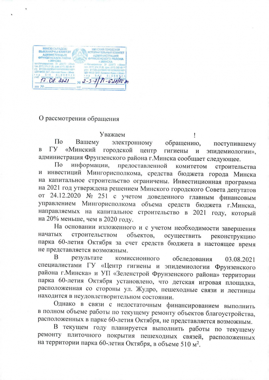 1. В обращении заявители указали на то, что парк 60-летия Великого Октября находится в плачевном состоянии, не соответствующем облику современного столичного парка. Пешеходные связи, лестницы, детское игровое оборудование находятся в аварийном состоянии, что может явится причиной детского травматизма, следовательно, предложенного администрацией Фрунзенского района г. Минска текущего ремонта явно недостаточно, в связи с чем, просим выполнить реконструкцию детской игровой площадки.