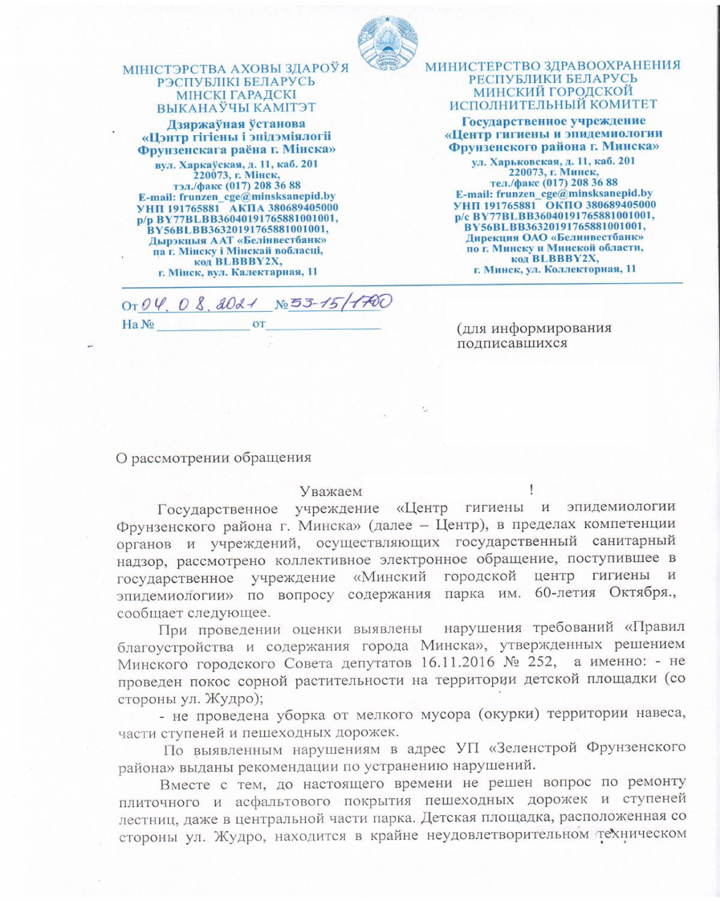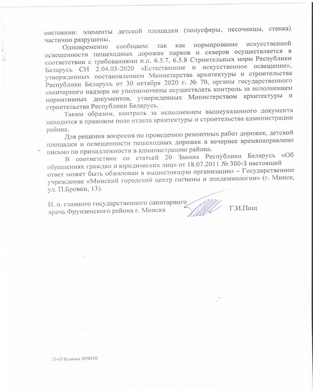 6. Повторно просим поручить ГУ "Центр гигиены и эпидемиологии Фрунзенского района г. Минска" произвести измерения средней освещённости в темное время суток всех пешеходных связей и лестниц, а также провести мониторинг санитарного и технического состояния парка и детского игрового оборудования.