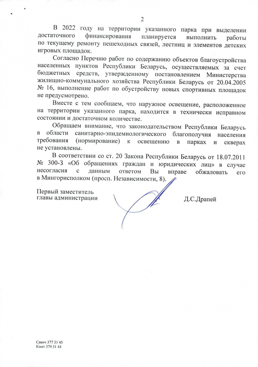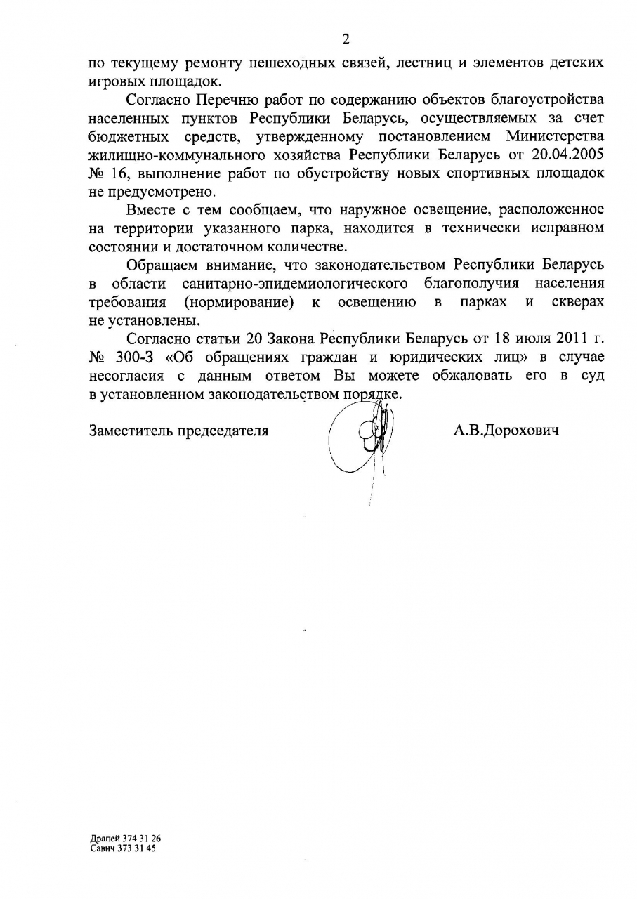 5. Дополнительно информируем, что для устройства дополнительного наружного освещения пешеходных связей парка балансодержателю территории необходимо заказать проект и выполнить работы по устройству освещения с последующей передачей сетей наружного освещения УП «Мингорсвет», а не просто написать письмо в адрес УП «Мингорсвет», что и просим сделать.