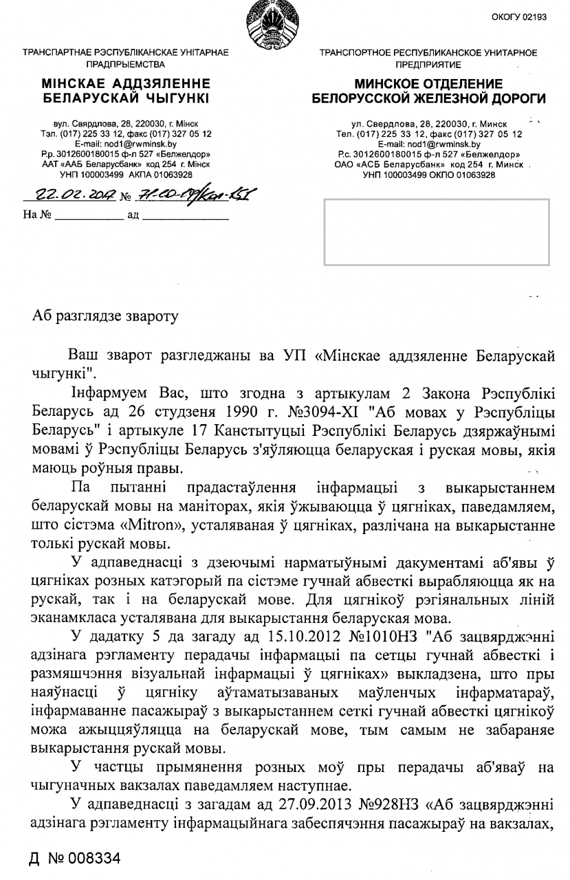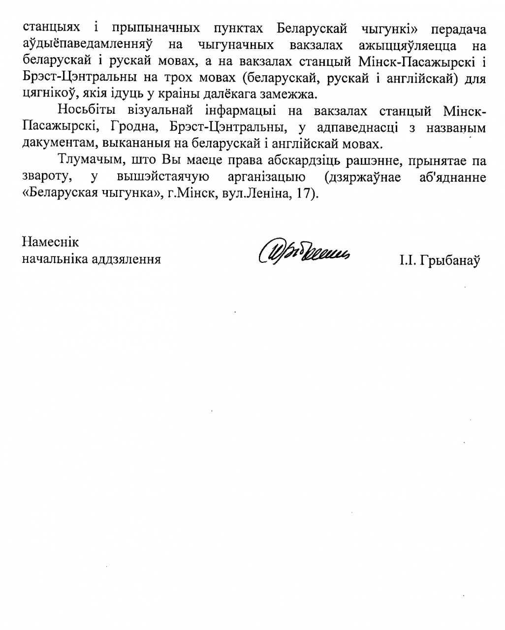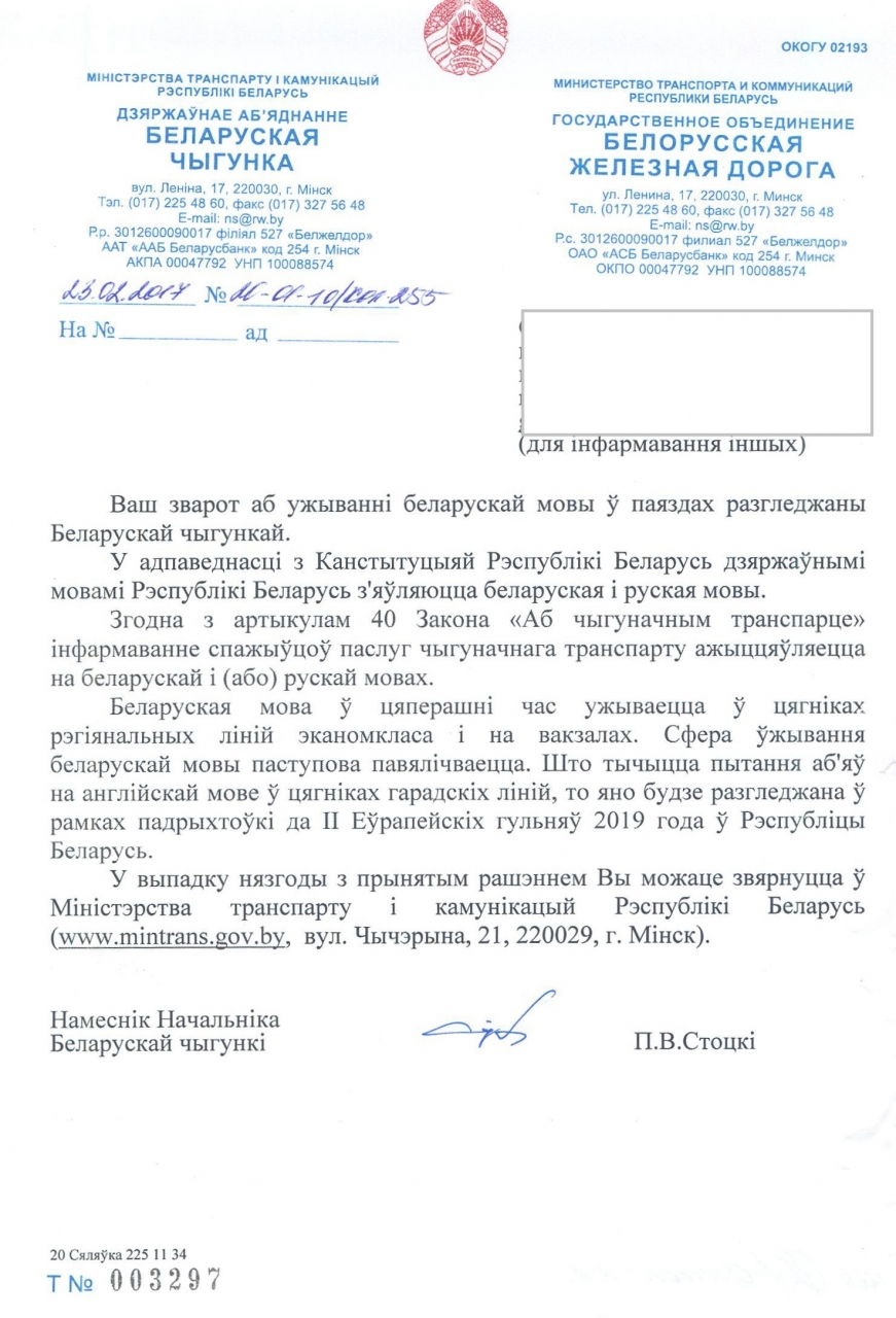 Звяртаемся да беларускай чыгункі з просьбай рабіць абвесткі і іншыя гукавыя і візуальныя паведамленні падчас руху цягнікоў і на прыпыначных пунктах на дзяржаўнай беларускай мове. А таксама просім вярнуць дубляванне абвестак на англійскай мове для падтрымання пазітыўнага іміджу Беларусі сярод замежных гасцей, якія не валодаюць рускай і беларускай мовамі, але карыстаюцца паслугамі чыгуначнага транспарту.