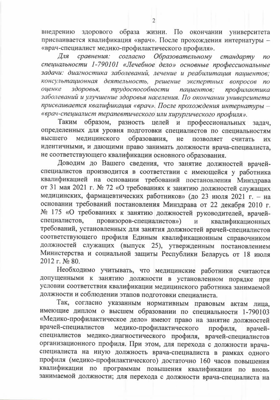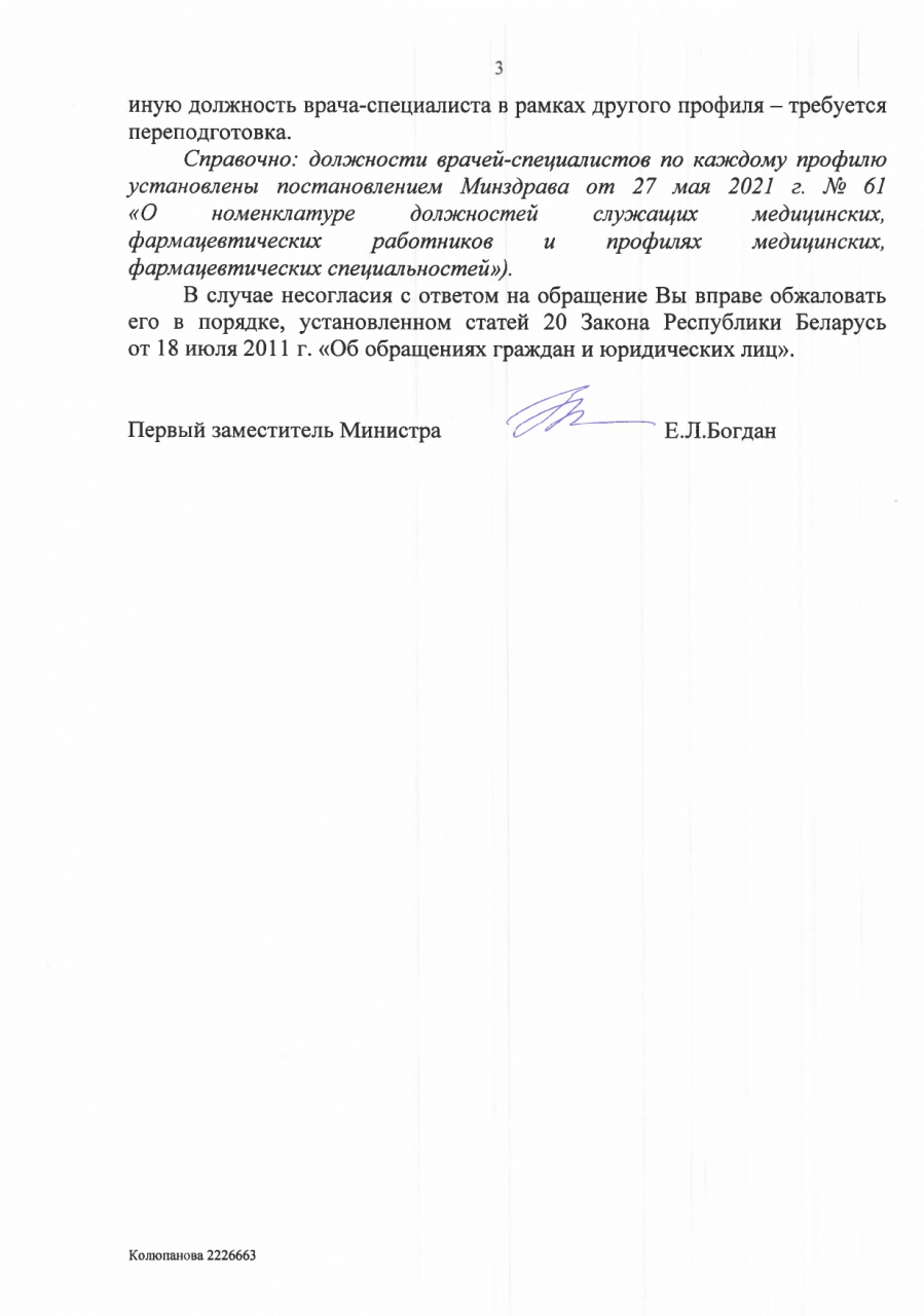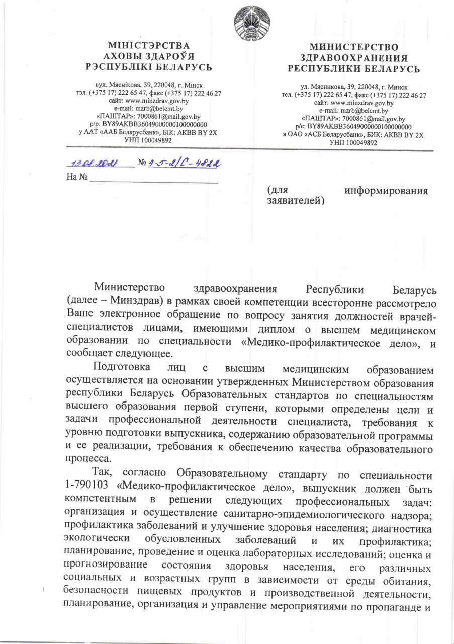 Переучиваться за свой счет у неё нет финансовой возможности, обучение в ГУО «Белорусская медицинская академия последипломного образования» стоит более 5 000 рублей. И сейчас первая заявительница данного обращения вынуждена не работать по специальности из-за бумажных ограничений. И, знаете, хотели бы сообщить, что много врачей, выпустившихся вместе с ней в 2018 году с медпрофа, уже не работают в медицине.