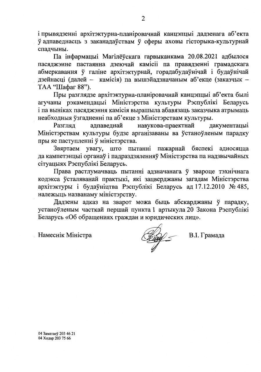 Па інфармацыі Магілёўскага гарвыканкама, 20.08.2021 адбылося пасяджэнне пастаянна дзеючай камісіі па правядзенні грамадскага абмеркавання ў галіне архітэктурнай дзейнасці. Пры разглядзе архітэктурна-планіровачнай канцэпцыі аб’екта былі агучаны рэкамендацыі Міністэрства культуры (аб неабходнасці карэкціроўкі аб'ёмна-прасторавага рашэння); камісія вырашыла абавязаць заказчыка атрымаць неабходныя узгадненні па аб’екце з Міністэрствам культуры.
