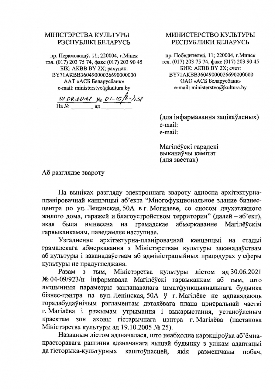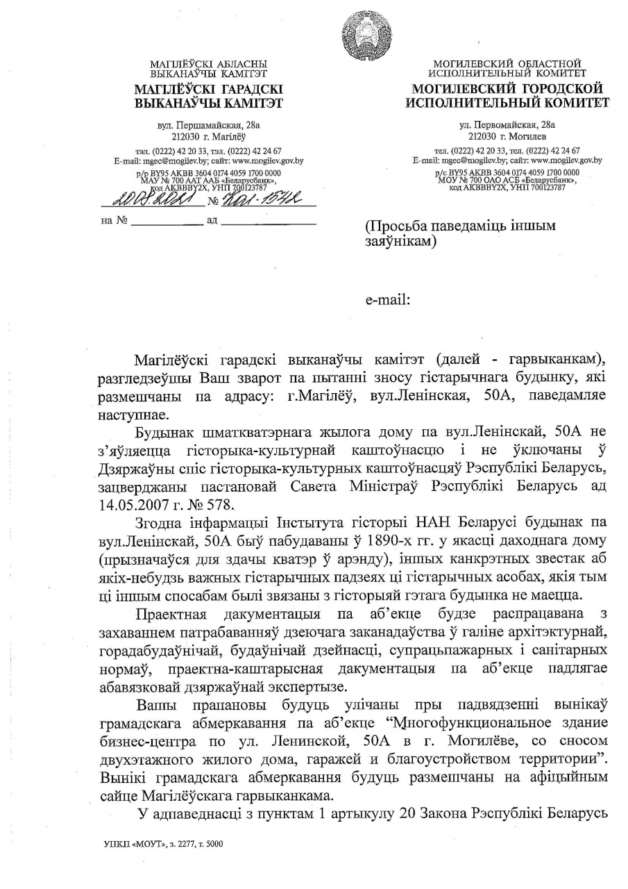 У сувязі з правядзеннем грамадскага абмеркавання архітэктурна-планіровачнай канцэпцыі аб'екта «Многофункциональное здание бизнес-центра по ул. Ленинской, 50А в г. Могилёве, со сносом двухэтажного жилого дома, гаражей и благоустройством территории» заяўляем аб недапушчальнасці ўзвядзення дадзенага аб’екта.