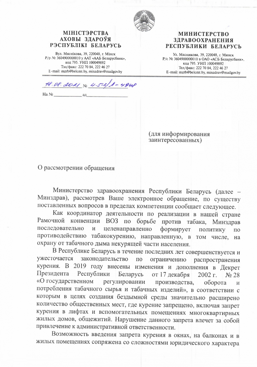 Возможность введения запрета курения в окнах, на балконах и в жилых помещениях сопряжена со сложностями юридического характера. Для урегулирования данного вопроса необходимо внесение изменений в гражданско-правовые и жилищные правоотношения, регулирование которых не является компетенцией Минздрава.