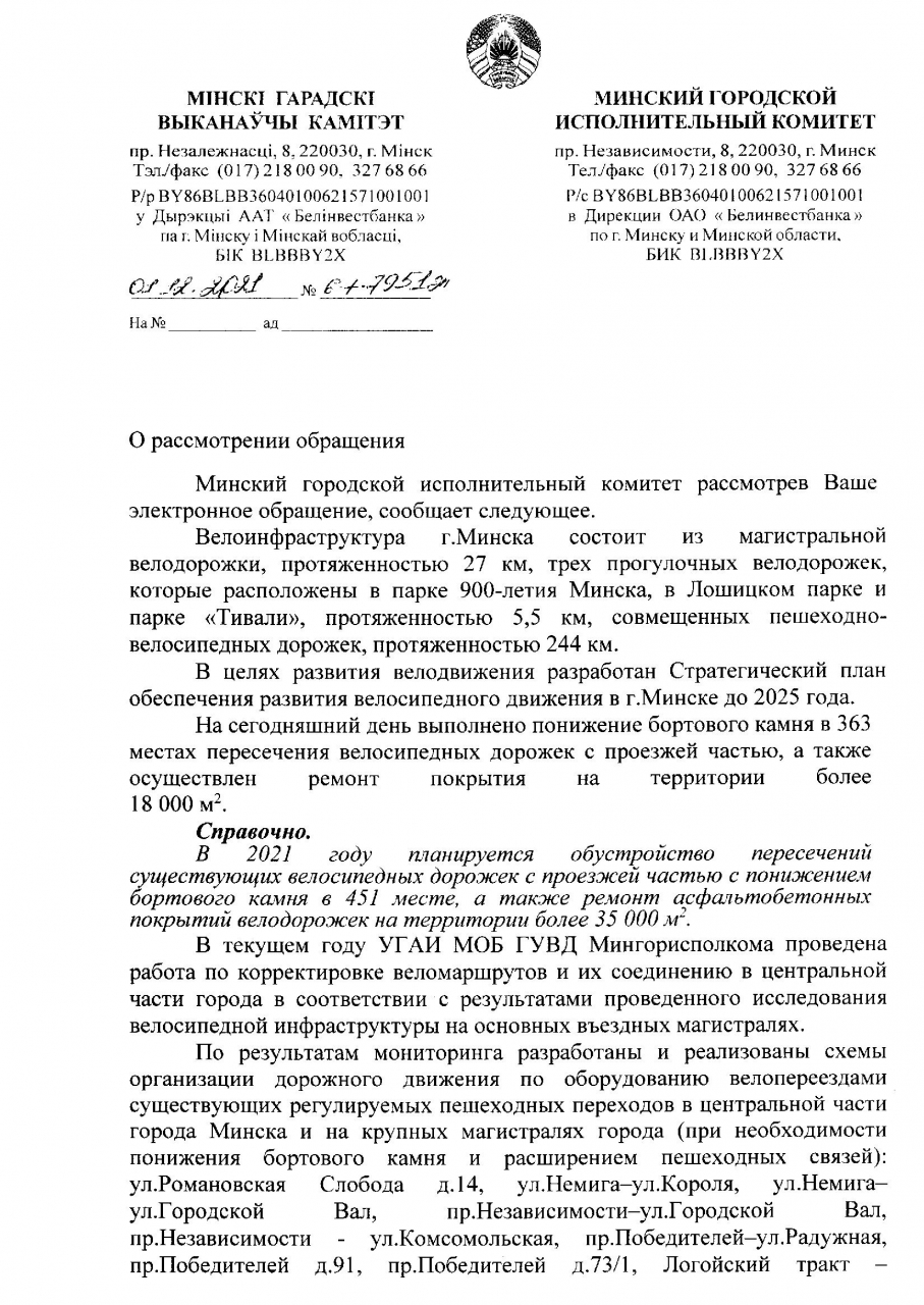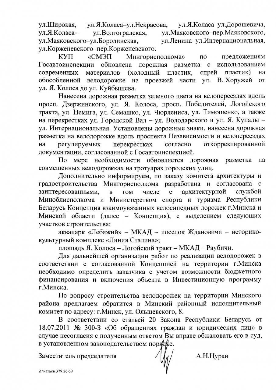 На основании изложенного, просим увеличить количество велосипедных дорожек по примеру минской велодорожки (не путем раскраски тротуаров, а устройства новых качественных велодорожек и велопарковок). Дополнительно просим увеличить протяжённость минской велодорожки (желательно с заездом на Заславское водохранилище и по его периметру).