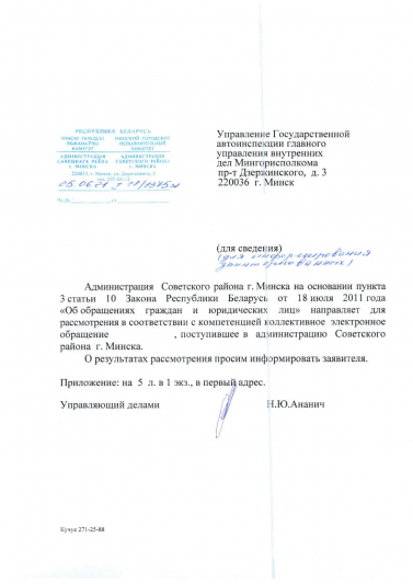 Обращение также направлено заявителями в администрацию Советского района г.Минска. Однако уведомлением от 25.06.2021 №1-18/1375эл (копия прилагается) администрация проинформировала нас о перенаправлении обращения для рассмотрения по существу в УГАИ ГУВД Мингорисполкома.