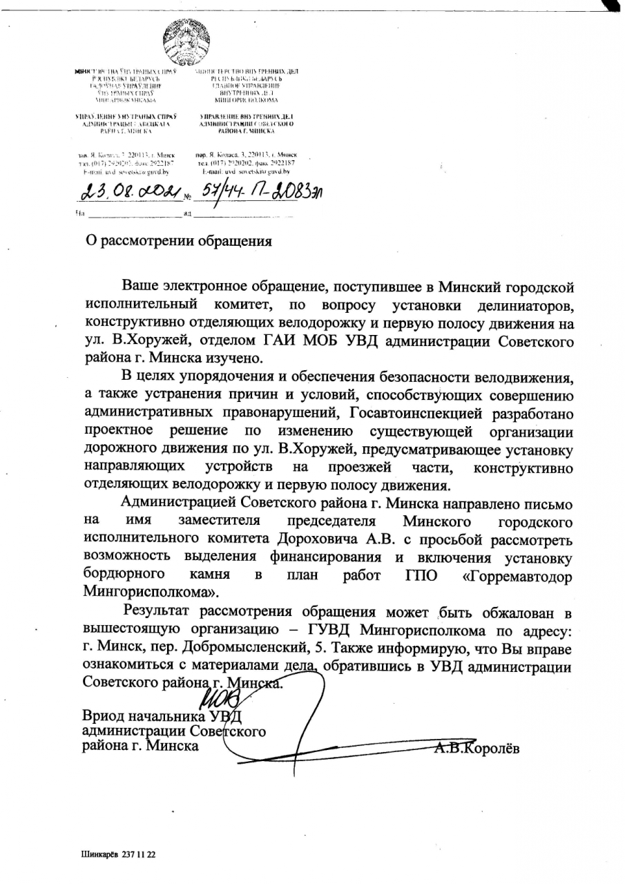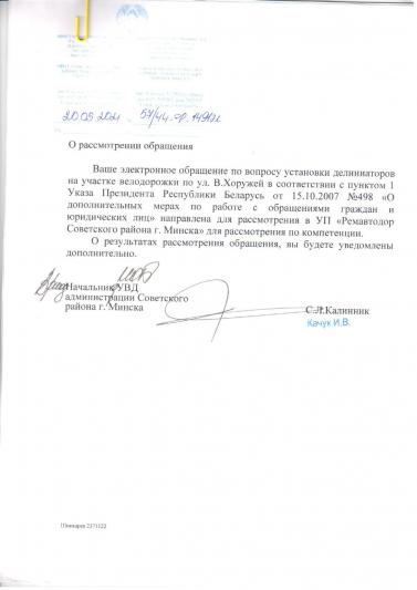 "5 мая 2020 г. получен ответ ГАИ УВД администрации Советского района г.Минска на электронное обращение по вопросу установки делиниаторов на всём протяжении велополосы на ул.Веры Хоружей. В ответе заместителя начальника Советского РУВД г.Минска Станиславчика В.И. от 05.05.2020 указано, что возможность установки делиниаторов между полосой для движения транспортных средств и велодорожкой рассматривается.