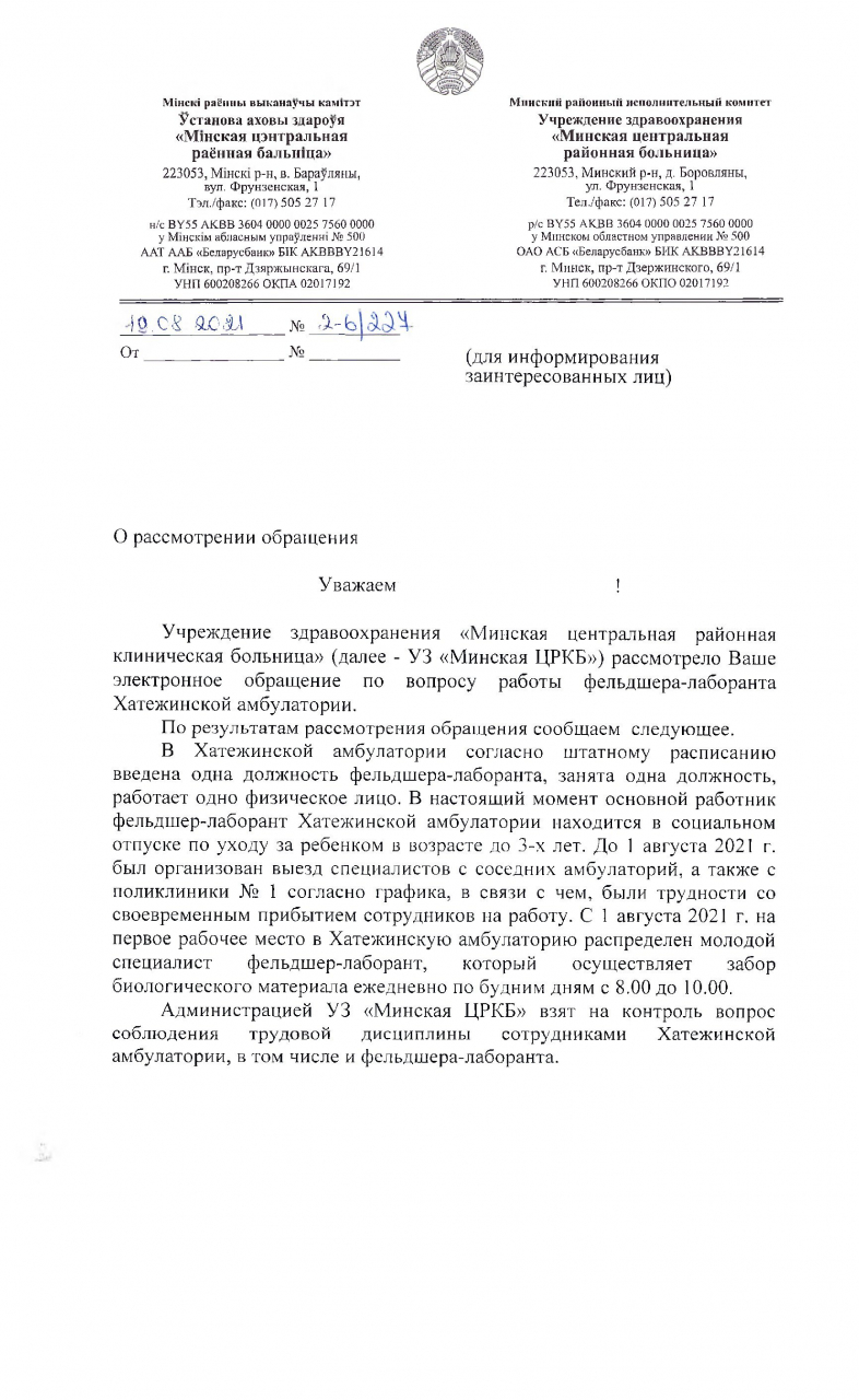 Мы, нижеподписавшиеся жители аг. Хатежино, аг. Старое Село и близлежащих населенных пунктов, а также иные заинтересованные лица, сообщаем вам, что в Хатежинской амбулатории 29 июля 2021 года забор крови для анализа начался в 9 часов 9 минут (при утвержденном времени начала работы кабинета 8 часов 30 минут).