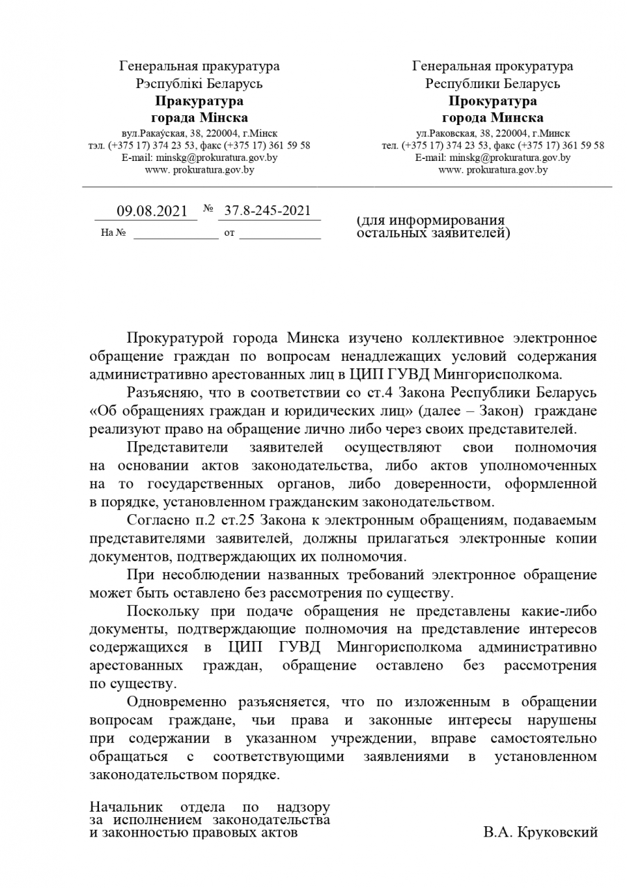 - провести проверку по факту публикации в телеграм-канале Правозащитного центра «Весна» фотографий одной из камер Центра изоляции правонарушителей ГУВД Мингорисполкома (ссылка: https://t.me/viasna96/6333), и установить: являются ли они правдивыми или «фейковыми» (в том числе путем проведения технической экспертизы опубликованных фотографий – в соответствии со статьей 27 Закона о прокуратуре);