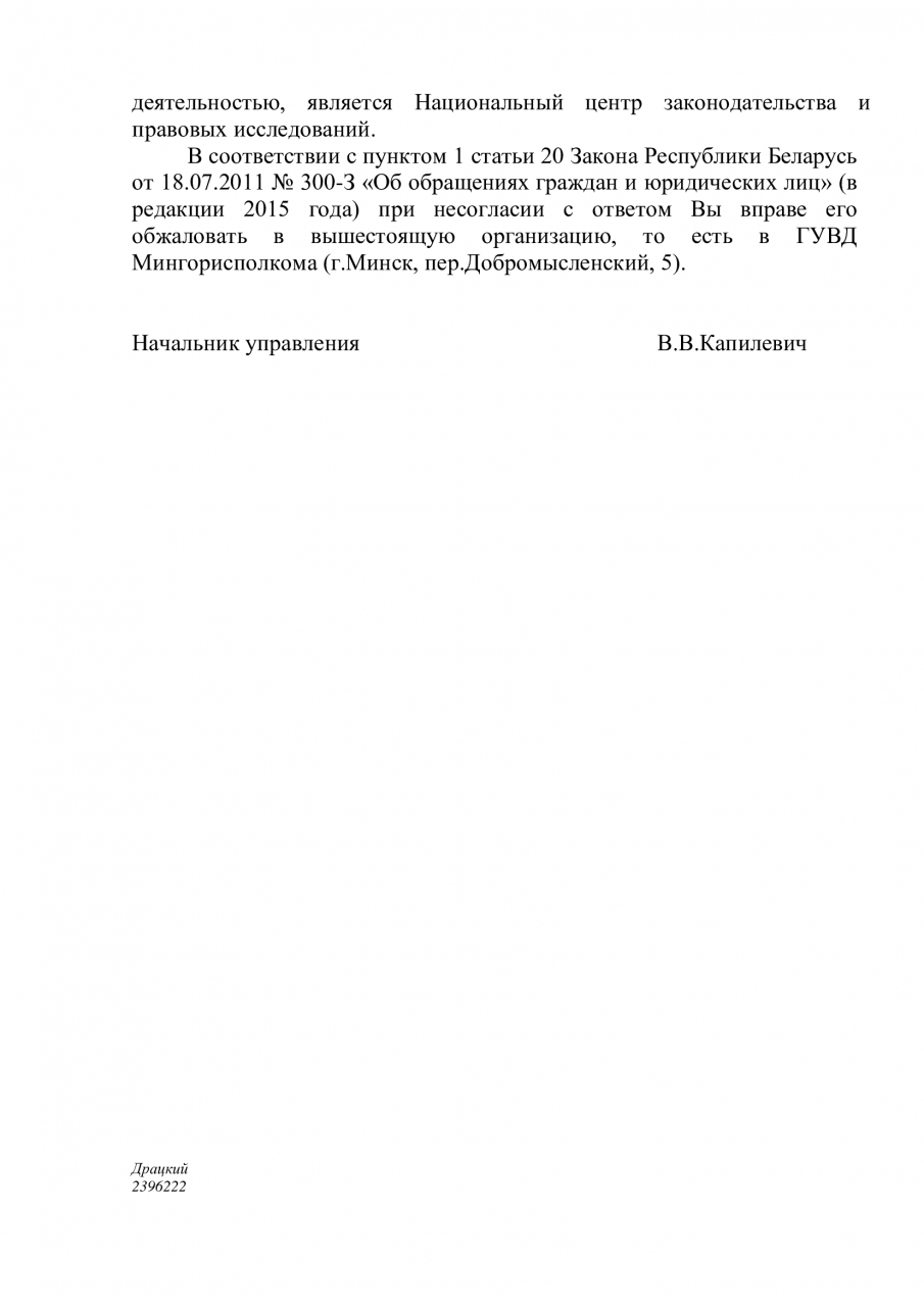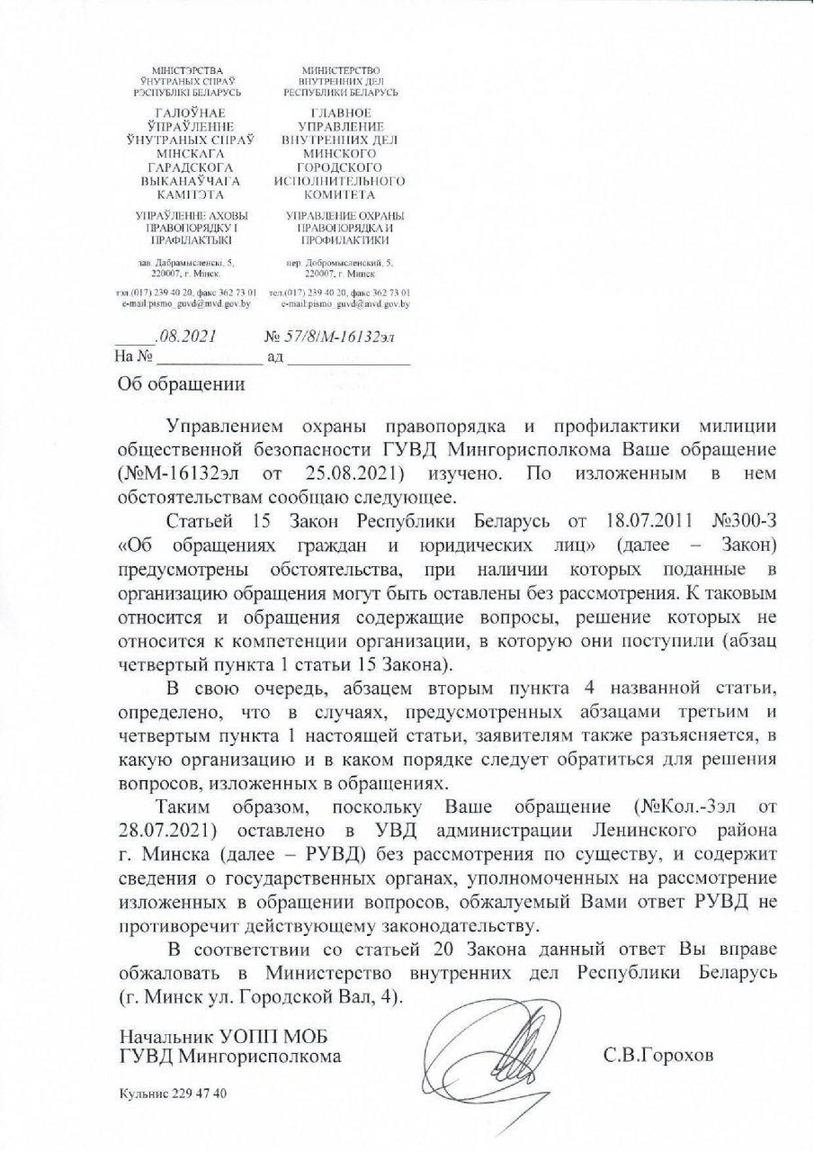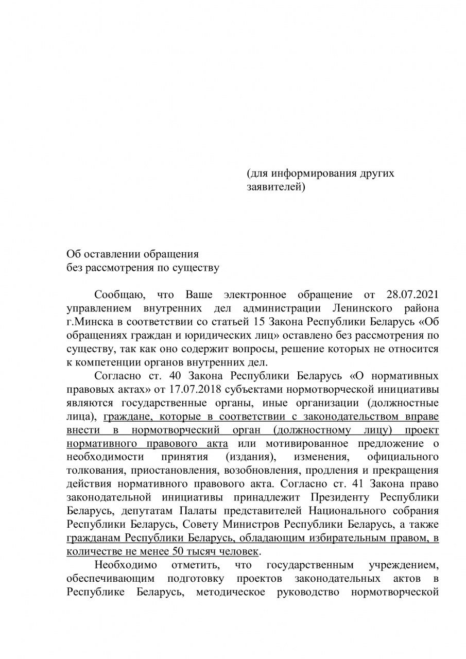 06.08.2021 был получен ответ на коллективное обращение в МВД от начальника УВД администрации Ленинского района г. Минска. Полученный ответ не соответствует Закону Республики Беларусь от 18.07.2011 № 300-З "Об обращениях граждан и юридических лиц" (далее - Закон № 300-З), и является формальной отпиской.