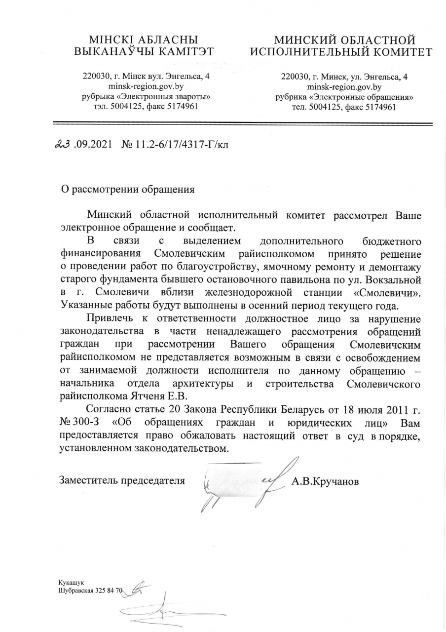 9 августа 2021 года был получен ответ Смолевичского райисполкома на электронное обращение по вопросам благоустройства привокзальной площади в г. Смолевичи - участка между зданием вокзала станции "Смолевичи" и улицей Вокзальной (копия ответа прилагается).