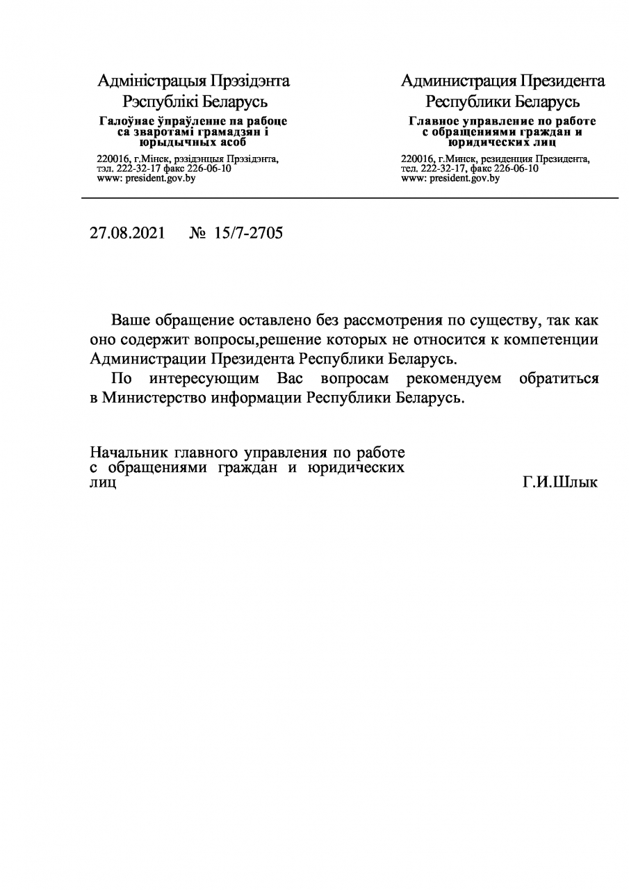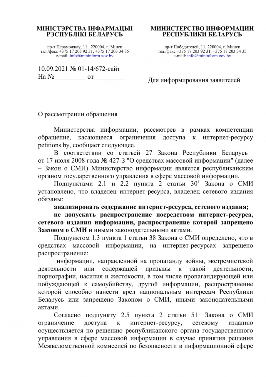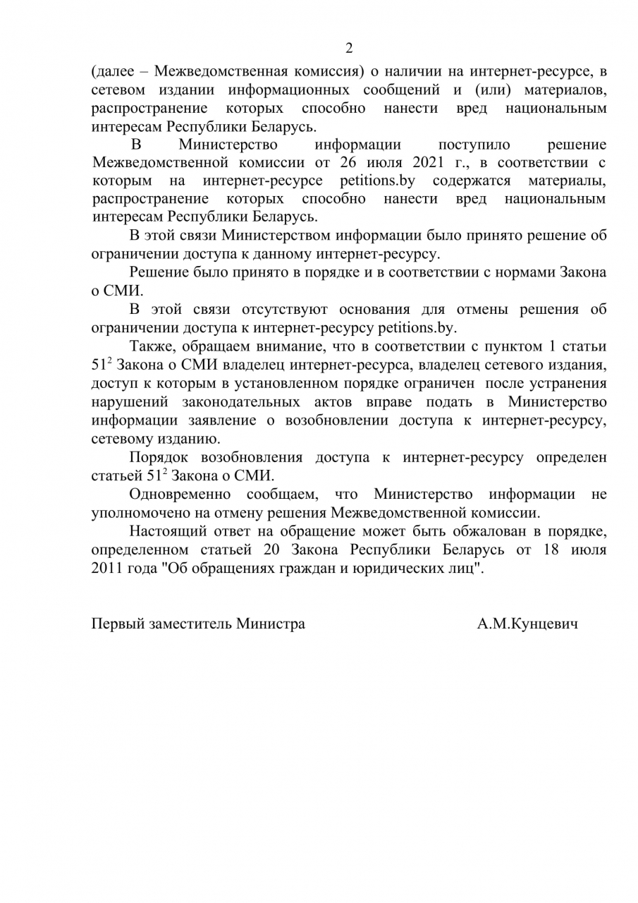 В свою очередь, 9 августа 2021 года Учреждение «Консультационный центр имплементации информационных технологий в гражданском обществе «Сивик тек», которое является владельцем портала «Удобный город» от Министерства информации (далее – Мининформ) было получено уведомление за подписью заместителя министра И.И.Бузовского. В уведомлении указано, что «принято решение об ограничении доступа (прим. – к сайту petitions.by) на территории Республики Беларусь».