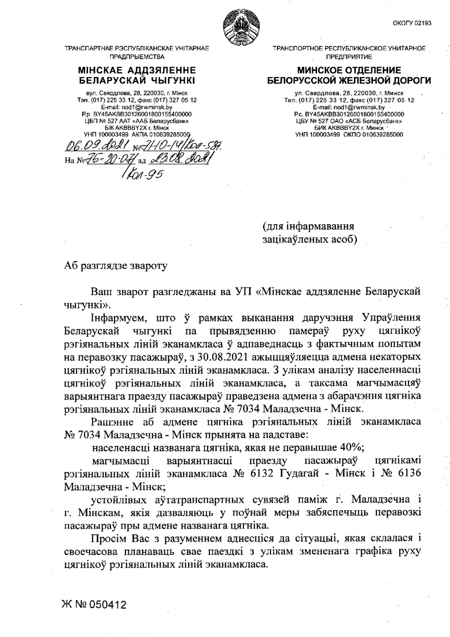 Мы разумеем складанае эканамічнае становішча Беларускай Чыгункі, таму прапануем вырашыць дадзенае пытанне кампрамісным чынам, які, на нашую думку, улічыць інтарэсы і Беларускай Чыгункі, і нас - пасажыраў, а менавіта: прызначыць з 3 верасня 2021 года курсаванне цягніка рэгіянальных ліній эканом-класа №7034 Маладзечна – Мінск у дні, калі пасажырапаток найбольшы – па пятніцах, суботах і нядзелях.