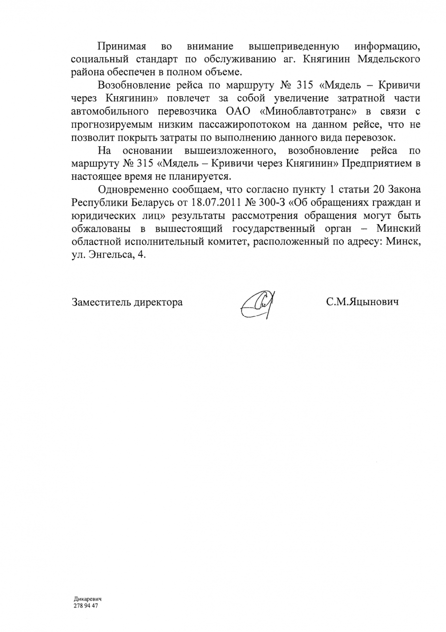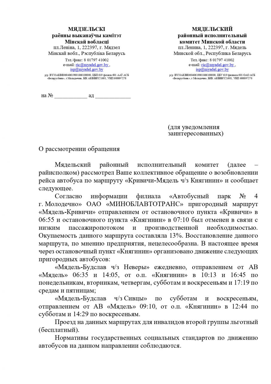 Восстановление пригородного маршрута "Мядель-Кривичи" (отправление от остановочного пункта "Кривичи" в 06:55 и остановочного пункта "Княгинин" в 07:10) нецелесообразно. В настоящее время через остановочный пункт "Княгинин" организовано движение нескольких пригородных автобусов.