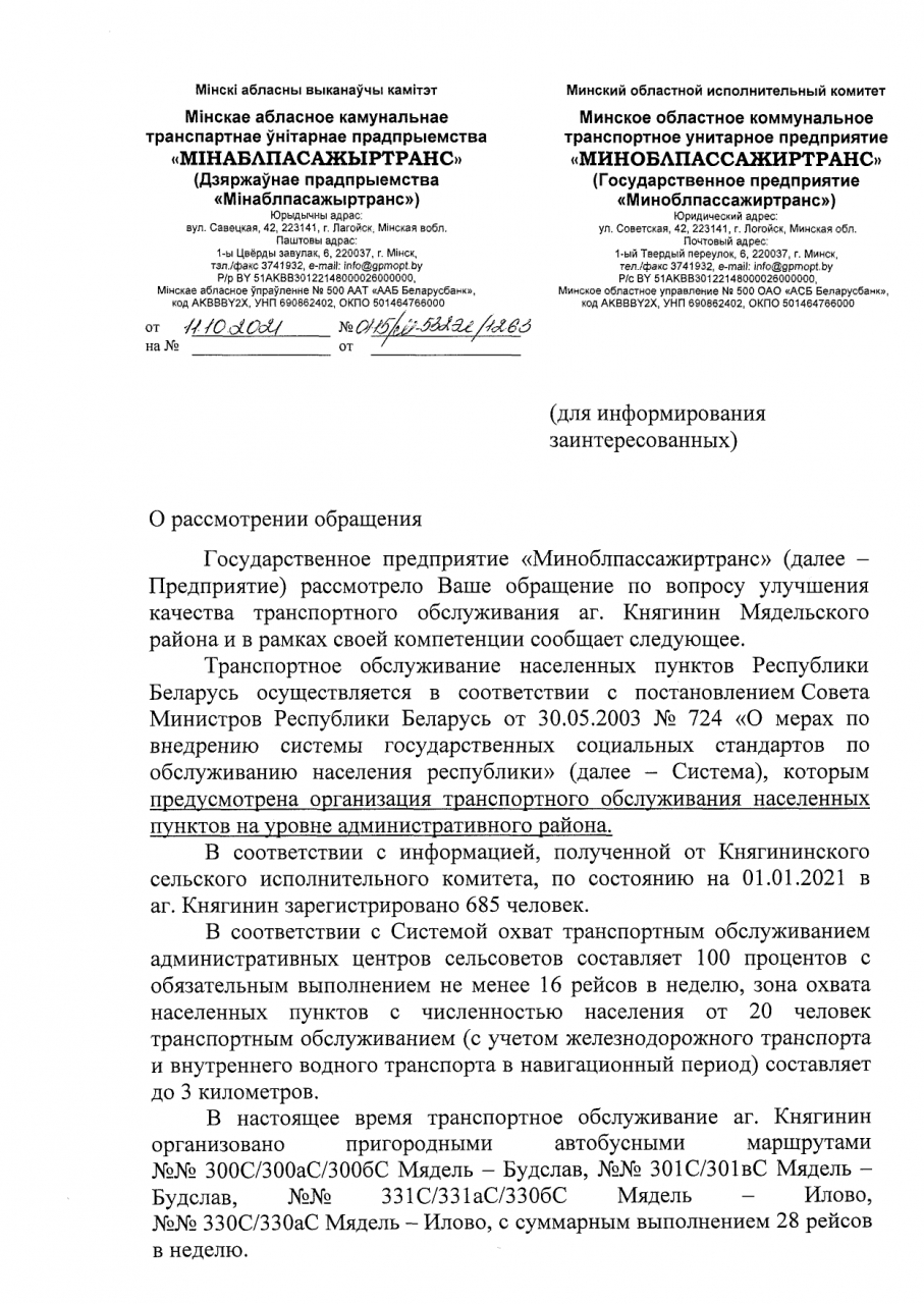 Настоящим обращением просим вернуть автобус, следовавший по маршруту Кривичи-Мядель через аг.Княгинин, который ходил каждый день в 7 ч. 08 мин. Его отменили из-за вируса, но так и не вернули.