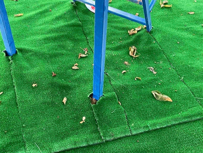 2) Покрытие. В ответе на коллективное обращение указано, что планируется устройство ударопоглощающего покрытия. Позже в разговорах с представителями ЖКХ ими упоминались планы по укладке резинового покрытия на бетонной основе, однако в результате было устроено покрытие из слабо утрамбованного песка, на которое был уложен рулонный искусственный газон.