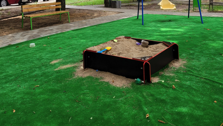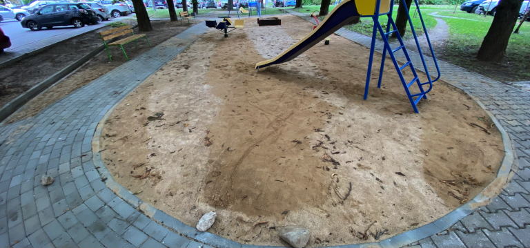 4) Песочница. При разговорах с представителями ЖКХ нами озвучивалось предложение о покупке песочницы с крышкой и бортами-сидениями, однако была установлена обычная песочница без вышеуказанных элементов. Засыпанный в песочницу песок использовался при строительстве, он не предназначен для песочниц, так как является крупнодисперсным с маленькими камнями. Отсутствие крышки приведёт к скорейшему загрязнению песка животными, а также попаданию в неё мусора, из-за чего песок в песочнице придётся менять чаще. Песок в песочнице такой же, как и подложка под покрытие.