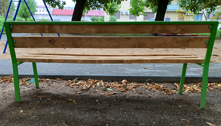 [Фото 10] – одна из установленных скамеек. Видно искривление планок сидения.