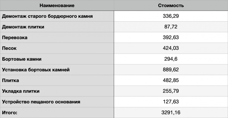 Согласно нашим расчётам, стоимость замены части тротуара составляет 3 291 рубль 16 копеек, что составляет 23,6% от общей стоимости работ по смете. [Фото 4] – стоимость замены тротуара.