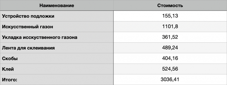 Согласно нашим расчётам стоимость укладки покрытия составляет 3 036 рублей 41 копейку, 21,8% от общей стоимости работ по смете.