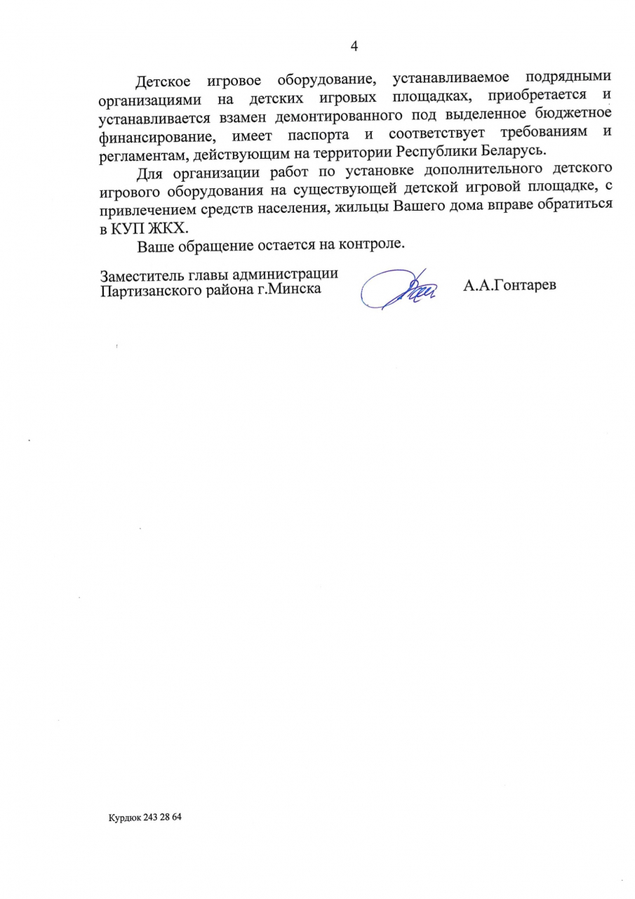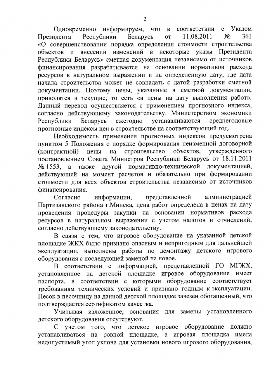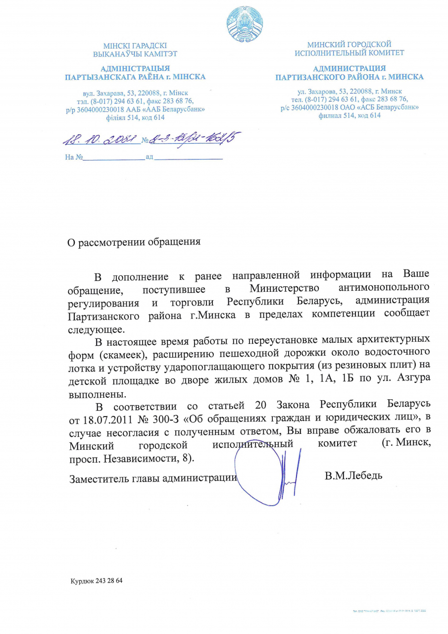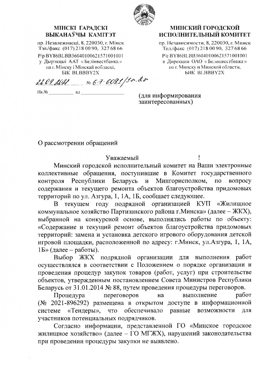 30 сентября 2020 года в администрацию Партизанского района города Минска (далее – Администрация района) и Коммунальное унитарное предприятие «Жилищное коммунальное хозяйство Партизанского района г.Минска» (далее – ЖКХ) было направлено коллективное электронное обращение по вопросам, связанным с обустройством детской площадки, которое подписали 59 человек. 6 и 15 октября 2020 года соответственно получены ответы от ЖКХ и Администрации района: в них указано, что детская игровая площадка включена в план благоустройства дворовых территорий Партизанского района на 2021 год.
