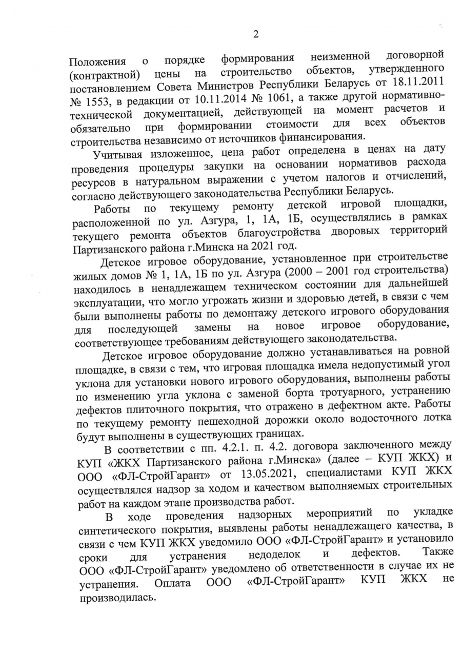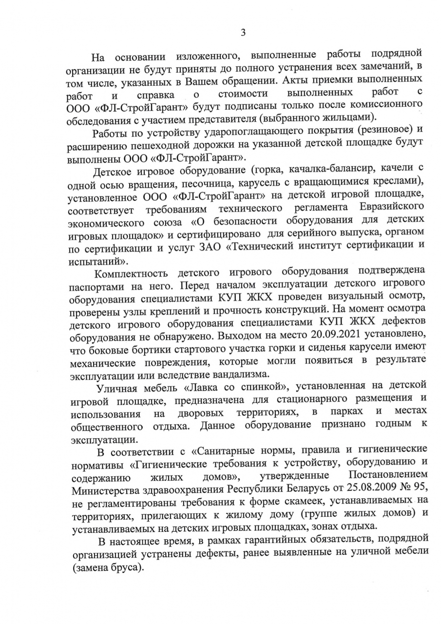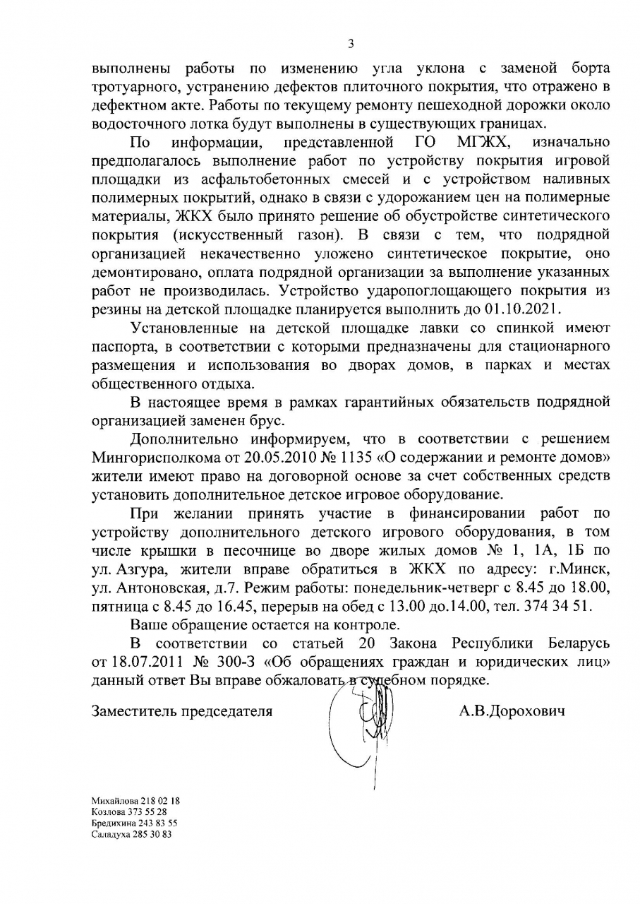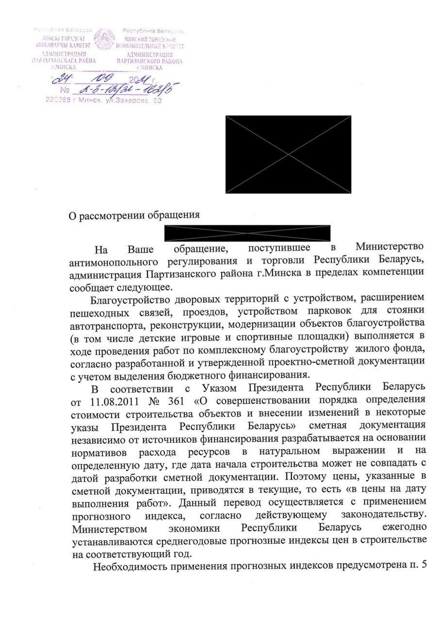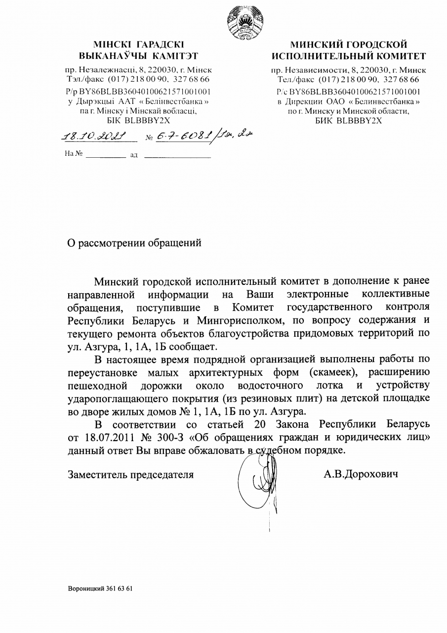 30 сентября 2020 года в администрацию Партизанского района города Минска (далее – Администрация района) и Коммунальное унитарное предприятие «Жилищное коммунальное хозяйство Партизанского района г.Минска» (далее – ЖКХ) было направлено коллективное электронное обращение по вопросам, связанным с обустройством детской площадки, которое подписали 59 человек. 6 и 15 октября 2020 года соответственно получены ответы от ЖКХ и Администрации района: в них указано, что детская игровая площадка включена в план благоустройства дворовых территорий Партизанского района на 2021 год.
