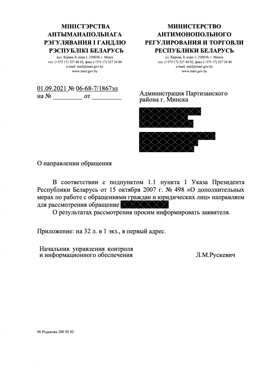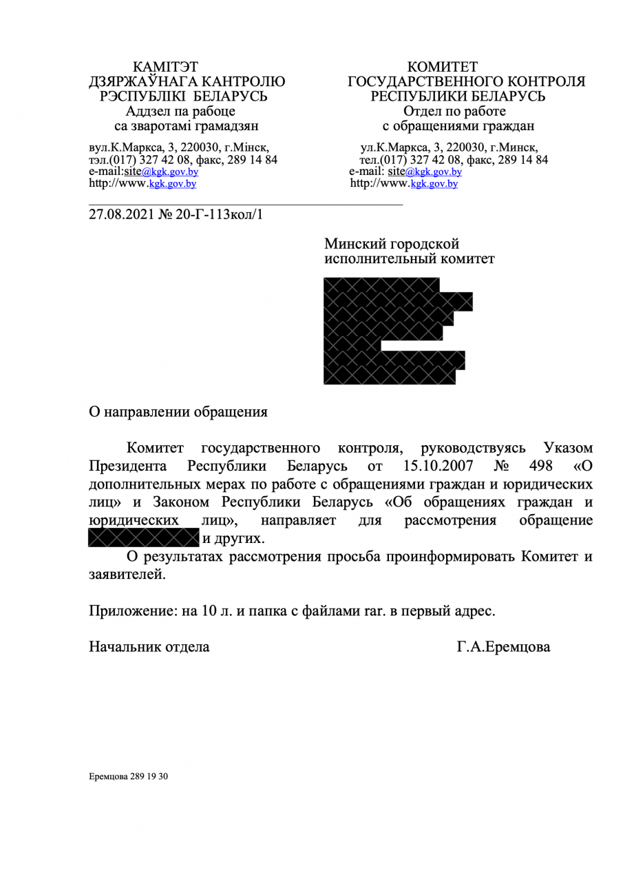 КГК направляет обращение в Минский городской исполнительный комитет и просит проинформировать заявителей и Комитет о результатах рассмотрения.