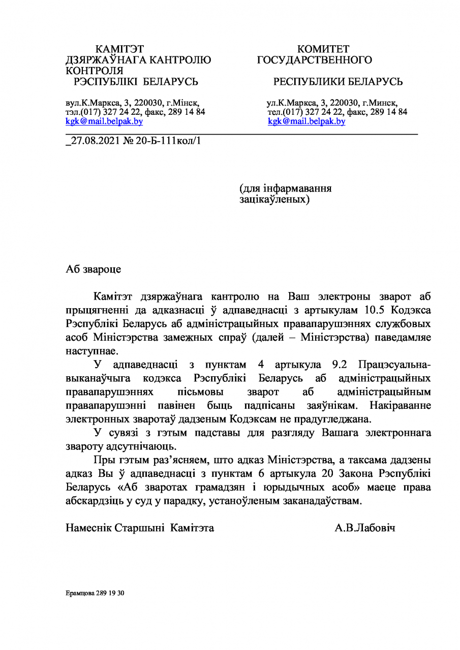 Дадзены адказ, на наш погляд, не адпавядае патрабаванням заканадаўства ў частцы поўнага, усебаковага і аб'ектыўнага разгляду зваротаў і накіравання матываваных і абгрунтаваных адказаў грамадзянам, а таксам патрабаванням прадстаўлення грамадзянам сапраўднай інфармацыі па наступных прычынах.