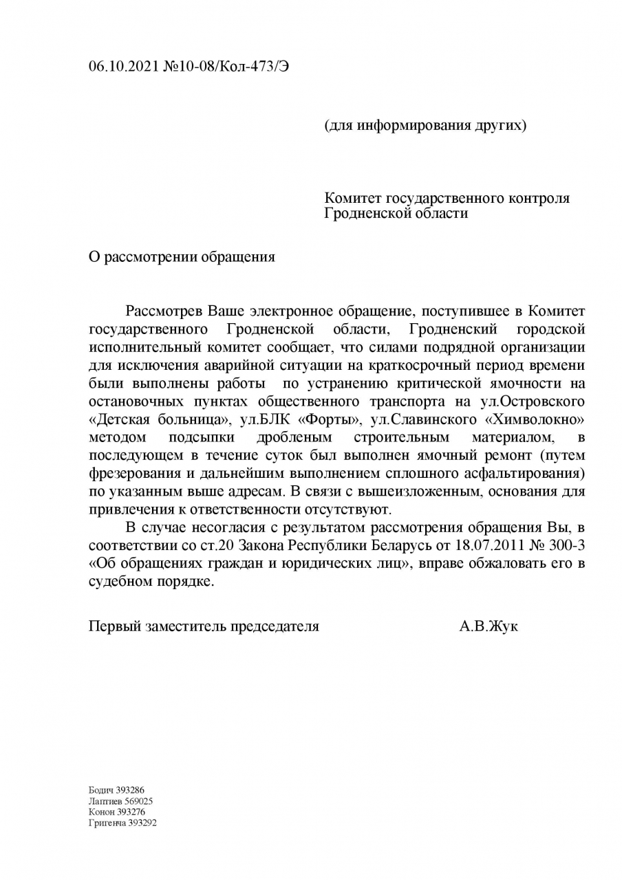 - установить должностных лиц, виновных в халатном проведении ремонтных работ улиц в городе Гродно, и привлечь их к дисциплинарной ответственность. Проинформировать заявителей в ответе на настоящее обращение о принятых к виновным должностным лицам мер дисциплинарной ответственности;