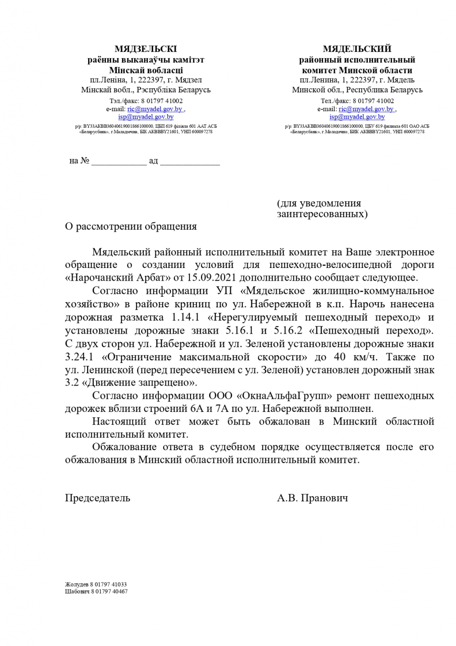 – установить за автоястоянкой нацпарка Нарочанского знаки «стоянка запрещена» с действием знака 1 км и ограничительные полусферы вдоль тротуара у магазина «Евроопт».