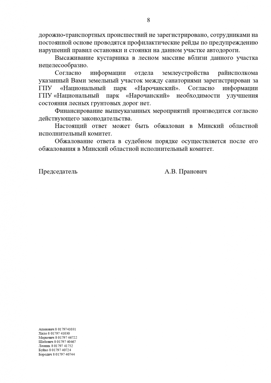 - перенести знак «движение запрещено» до границ микрорайона Степенёво с установкой двух металлических, антивандальных шлагбаумов на набережной между сан Нарочанка и Спутник, т.к даже в зимний период можно наблюдать парковку авто на берегу оз. Нарочь.