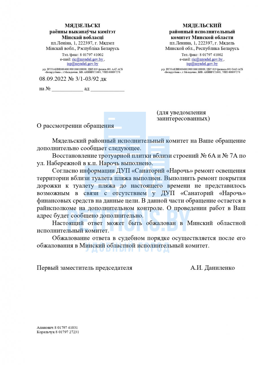 - узаконить тротуар без собственника (передать на баланс ЖКХ) от набережной до территории «филиал «Нарочанский берег» с реконструкцией осветительных опор кпк было обещано на общественных слушаниях по проклалке высоковольных кабелей на курорте.