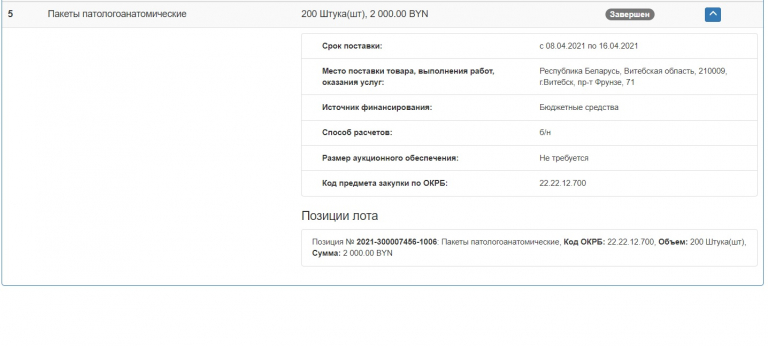 - апрель 2021 года: пакеты патологоанатомические (200 штук); сумма закупки - 2 000.00 BYN; срок поставки: c 08.04.2021 по 16.04.2021; закупка состоялась / https://goszakupki.by/marketing/view/314014