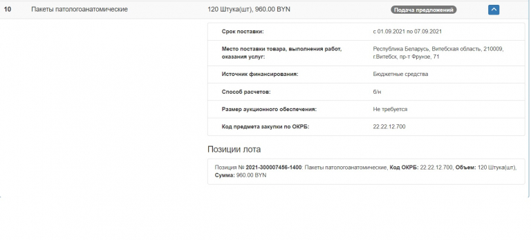 - сентябрь 2021 года: пакеты патологоанатомические (120 штук); сумма закупки - 960.00 BYN; срок поставки: c 01.09.2021 по 07.09.2021; процедура закупки находится в стадии подачи предложений / https://goszakupki.by/marketing/view/433764