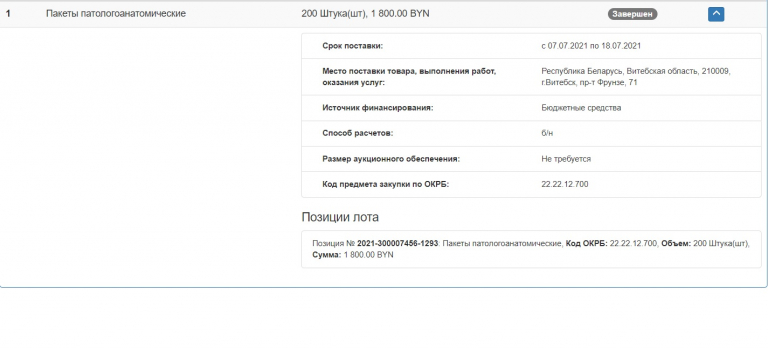 Согласно данным электронной торговой площадки https://goszakupki.by/, УЗ "Витебская городская клиническая больница скорой медицинской помощи" с апреля по сентябрь 2021 года 2 раза осуществляло закупку пакетов патологоанатомических за счет бюджетных средств; также в августе 2021 года была объявлена еще одна процедура закупки: