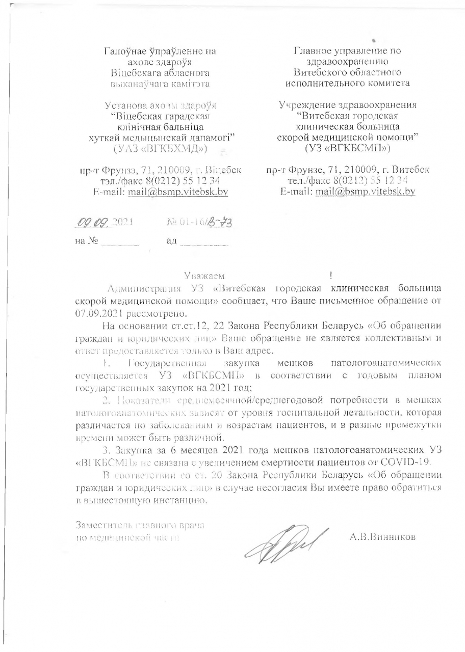 - связана ли закупка за неполные 6месяцев 2021 года 400 + 120 пакетов патологоанатомических в УЗ "Витебская городская клиническая больница скорой медицинской помощи" с большой смертностью пациентов учреждения от COVID-19?