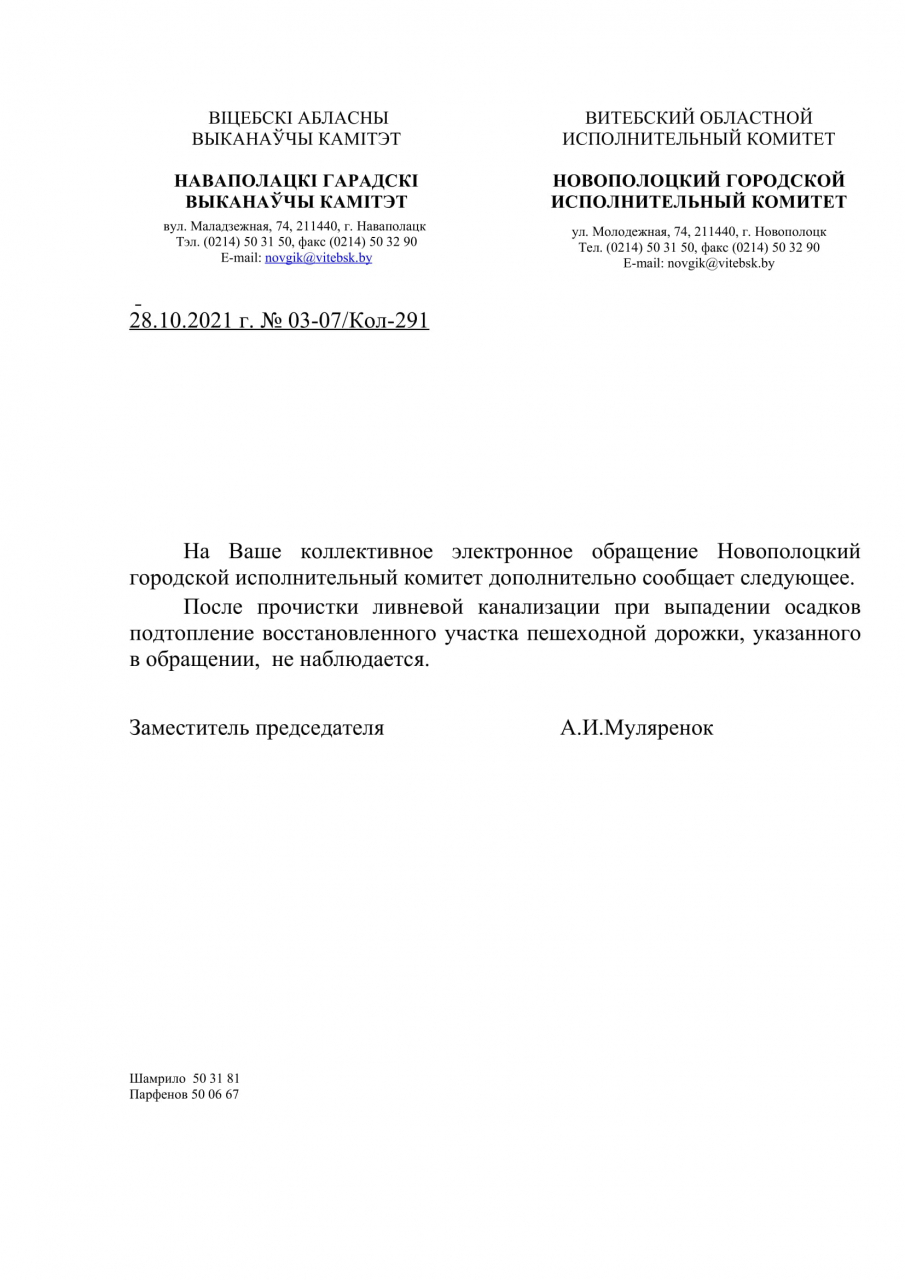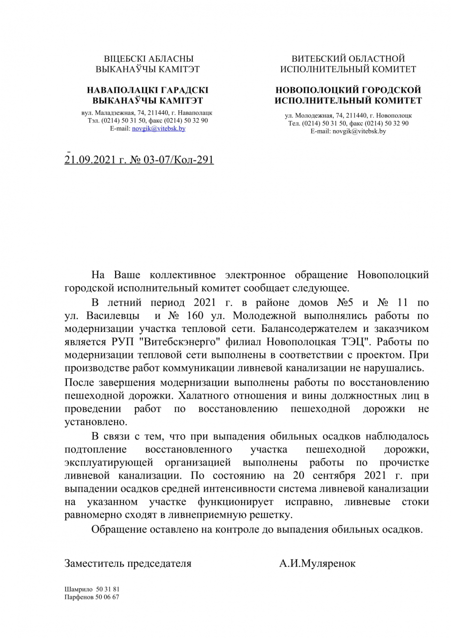 - провести проверку фактов подтопления пешеходной дорожки между домами №№ 5 и 11 по улице Василевцы в Новополоцке;