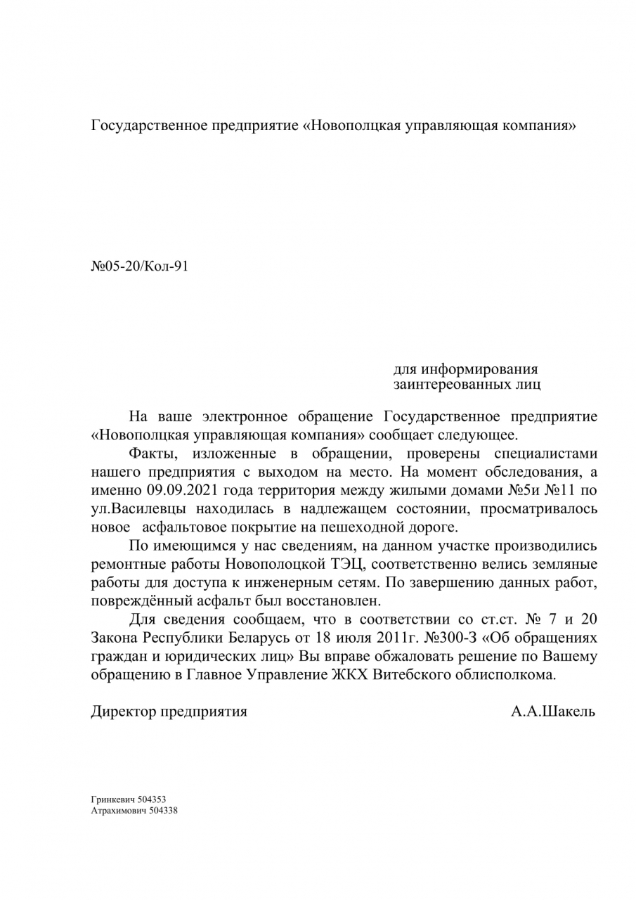 - установить должностных лиц, виновных в халатном проведении ремонтных работ по обустройству пешеходной дорожки между домами №№ 5 и 11 по улице Василевцы в Новополоцке, которая вследствие дождя оказалось полностью затопленной, и сообщить в ответе на указанное обращение о принятых к ним мерах дисциплинарной ответственности (согласно пункту 3 статьи 5 и статьи 26 Закона Республики Беларусь от 18.07.2011 № 300-З «Об обращениях граждан и юридических лиц»);