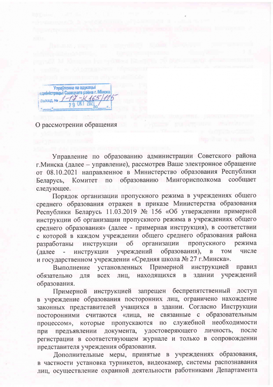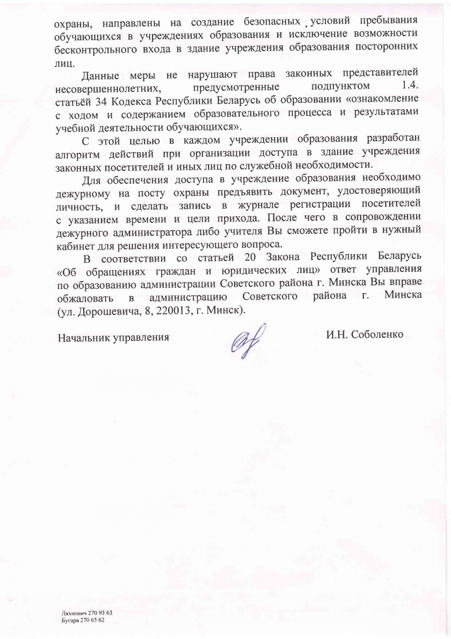 Дополнительные меры, принятые в учреждениях образования, в частности, установка турникетов, видеокамер, осуществление охранной деятельности Департамента охраны, направлены на создание безопасных условий пребывания обучающихся и исключение бесконтрольного входа в здание учреждения образования посторонних лиц. Данные меры не нарушают прав законных представителей несовершеннолетних.