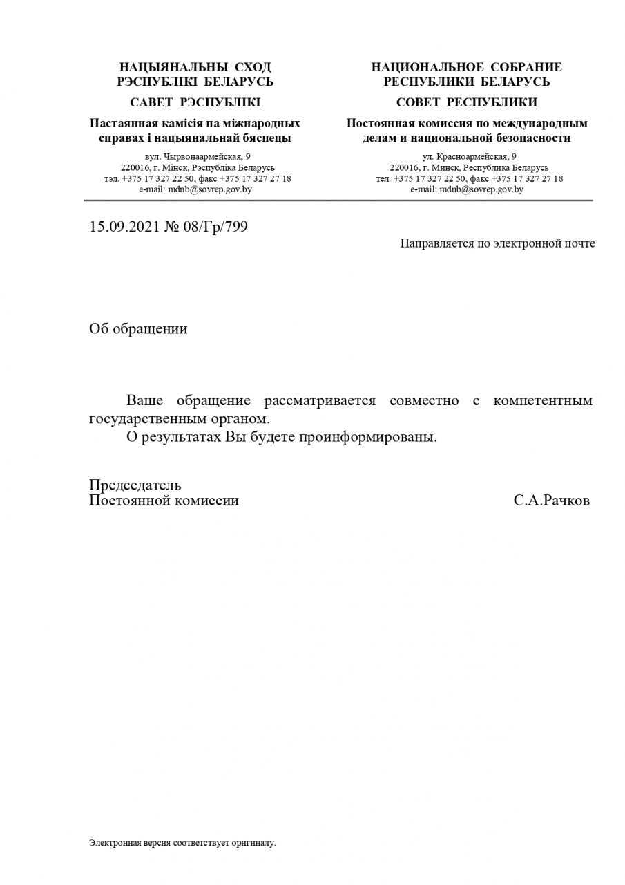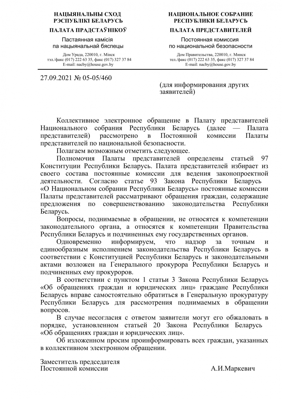 Исходя из вышеперечисленной информации, обращаемся к Вам в соответствии со ст. 11 Закона «О статусе депутата Палаты представителей, члена Совета Республики Национального собрания Республики Беларусь» и требуем: