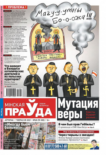У нумары газеты “Мінская праўда” ад 07.09.2021 на вокладцы размешчана карыкатура на святароў: у некаторых на шыі вясіць крыж з загнутымі пад прамым вуглом канцамі падобны да свастыкі, у аднаго ў руках намаляваны бела-чырвона-белы сцяжок. Усе разам яны нібыта спяваюць “Магуты Божа”, дзе пад клічкнікамі выяўленыя таксама нацысцкія сымбалы. Да таго жа на версе камічнага малюнка выяўлена быццам ікона з надпісам “Rosica», (Росіца - вёска ў Беларусі, дзе знаходзіцца Касцёл Святой Троіцы). На карыкатуру нанесены загаловак “Мутация веры. Кресты бывают разные…» і падзагаловак “Что волнует в Беларуси католических деятелей и их польских кураторов». Фота пазначанай вокладцы прыкладзена да звароту.