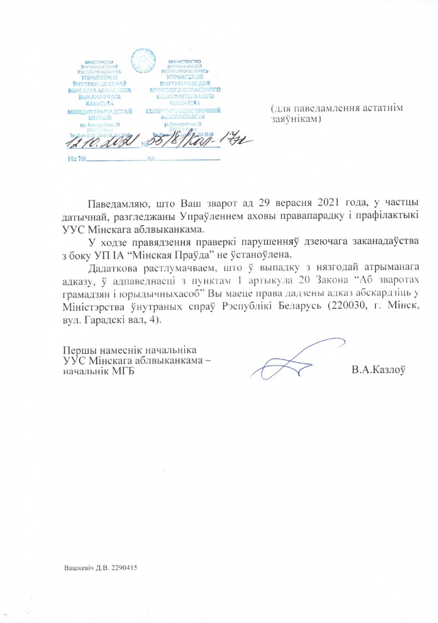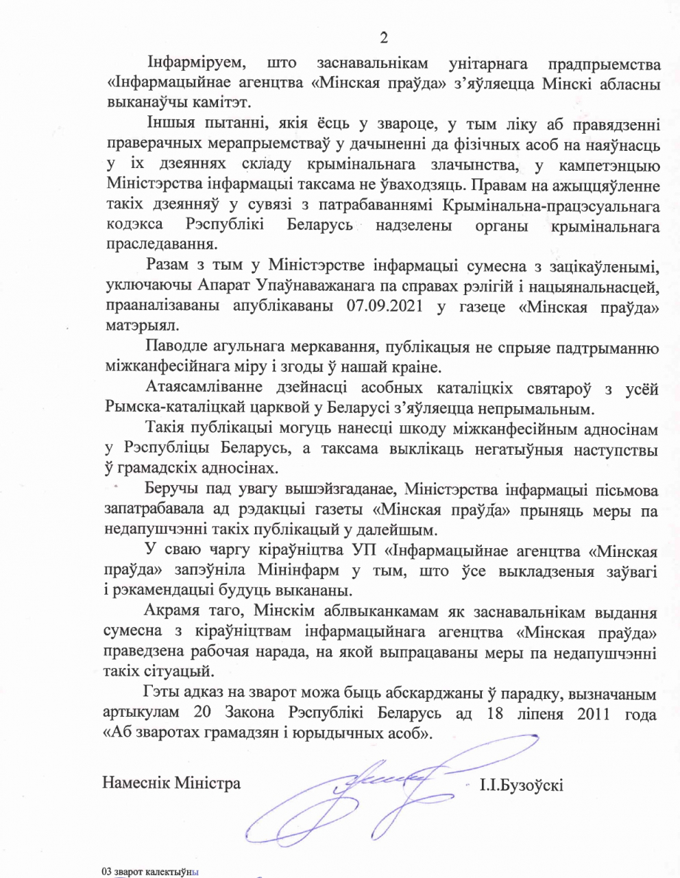 Міністэрства інфармацыі пісьмова запатрабавала ад рэдакцыі газеты "Мінская праўда" прыняць меры па недапушчэнні публікацый матэрыялаў, такіх як у выпуску ад 07.09.2021, у далейшым. Мінскім аблвыканкамам сумесна з кіраўніцтвам ІА "Мінская праўда" праведзена рабочая нарада, на якой выпрацаваны меры па недапушчэнні такіх сітуацый.