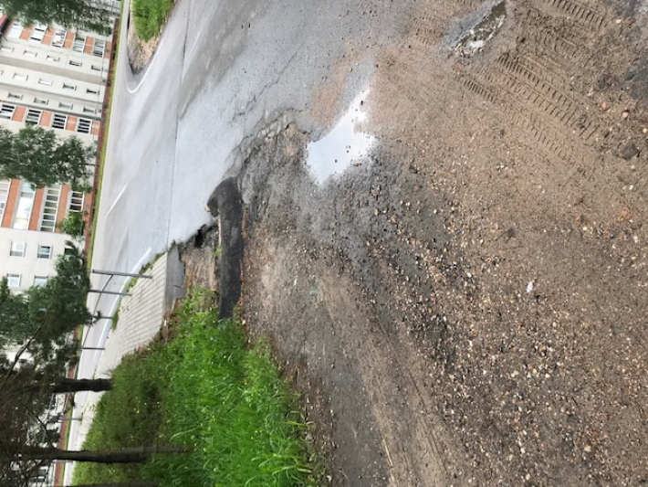 • путь от остановки Учхоз перекрывают ветви дерева, которые свешиваются прямо над тротуаром. Дальше тротуар обрывается и на пути возникает яма, образовавшаяся из-за большого наклона дороги и сильного стока воды в этом месте (водой размыло грунт и уже начинается разрушение асфальта проезжей части);