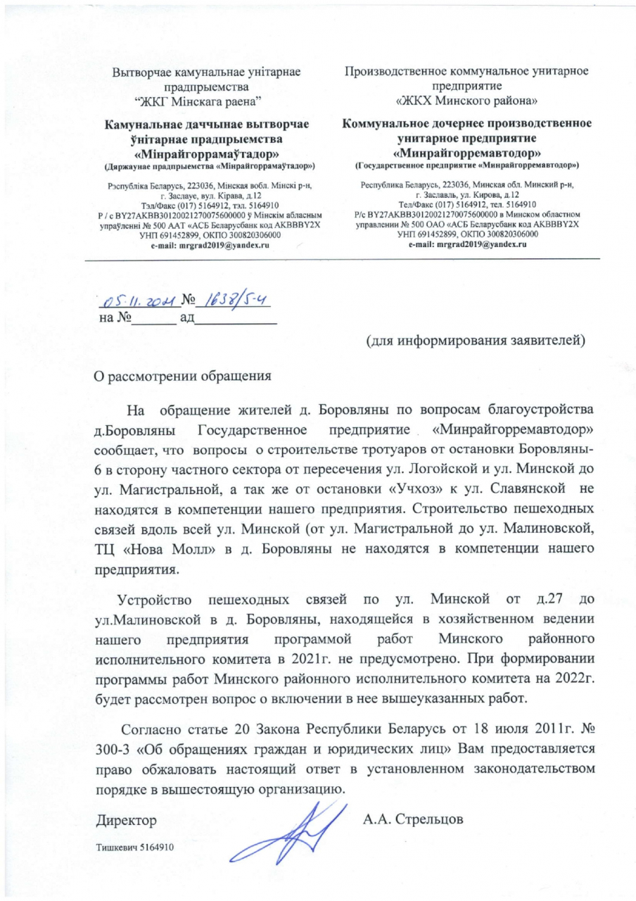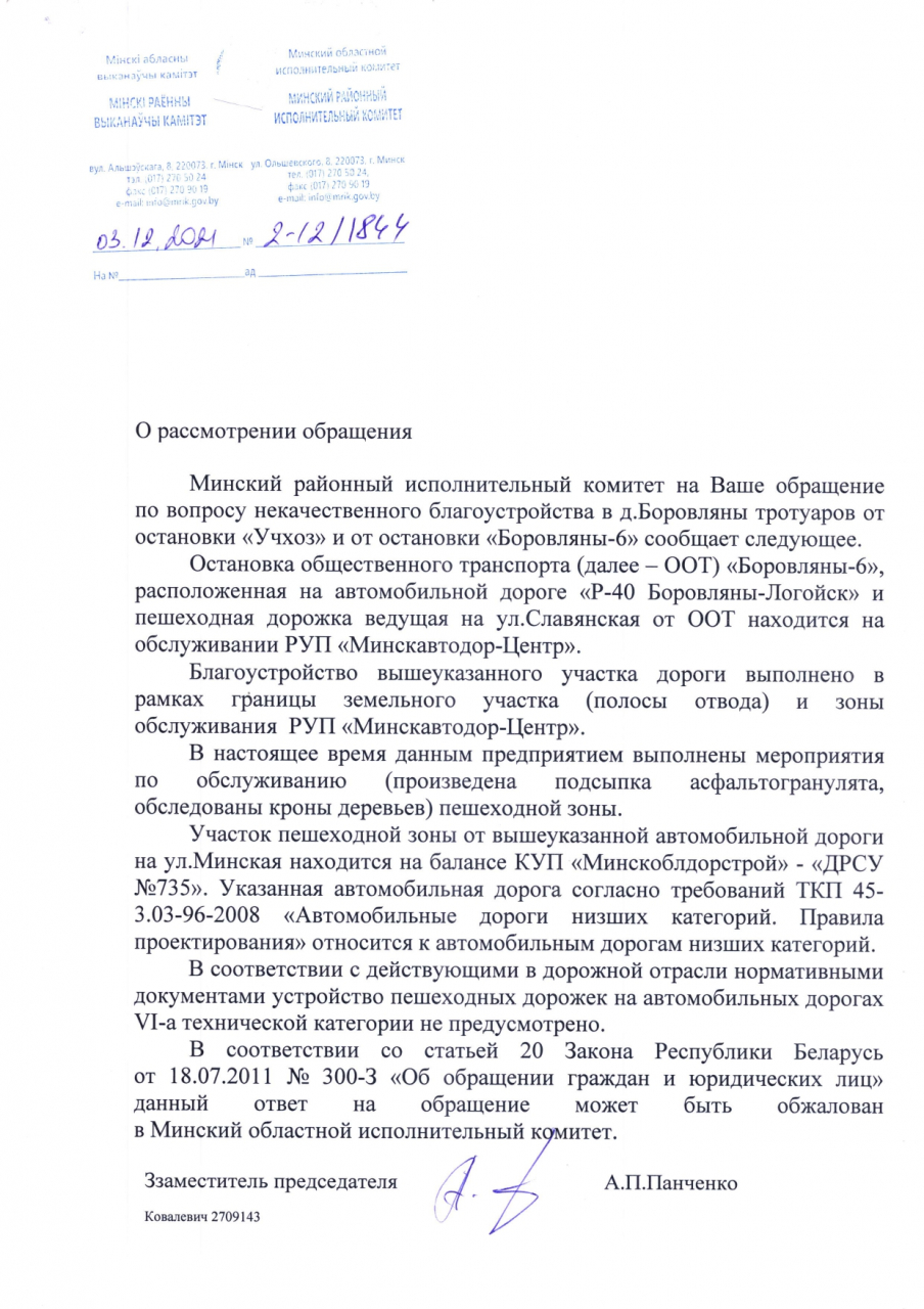 Приложение: 1. Фото тротуаров от остановок Боровляны-6 и Учхоз в формате jpg.