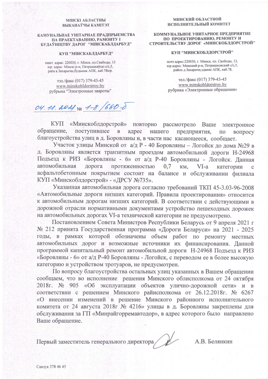 РУП "Минскавтодор-Центр" выполнено благоустройство участка дороги, включающего остановку общественного транспорта "Боровляны-6" и пешеходную дорожку, ведущую на ул.Славянская. Автодорога Р-40 Боровляны-Логойск относится к автодорогам низшей категории, где устройство пешеходных дорожек не предусмотрено.