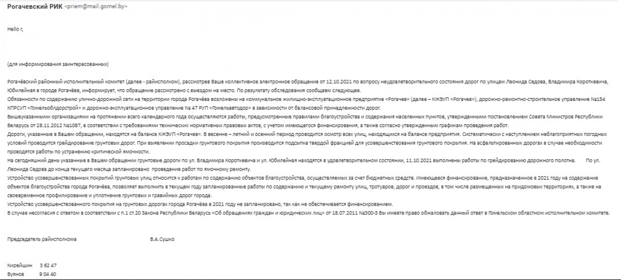 - выделить необходимые средства для реконструкции и/или ремонта улиц Рогачёва и дворовых территорий нашего города.