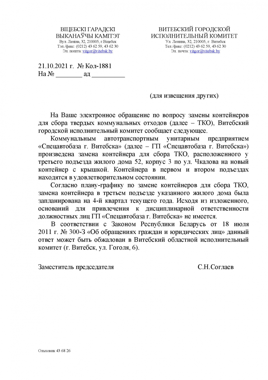 - обеспечить замену контейнера для сбора твердых коммунальных отходов, расположенного по адресу: г. Витебск, ул. Чкалова, д. 52, корп. 3 - на соответствующий требованиям 1) Санитарных норм, правил и гигиенических нормативов «Гигиенические требования к содержанию территорий населенных пунктов и организаций»; 2) ТКП «Охрана окружающей среды и природопользование. Отходы. Правила обращения с коммунальными отходами», утв. постановлением Министерства жилищно-коммунального хозяйства Республики Беларусь и Министерства природных ресурсов и охраны окружающей среды Республики Беларусь от 30.07.2020 № 13/4-Т;
