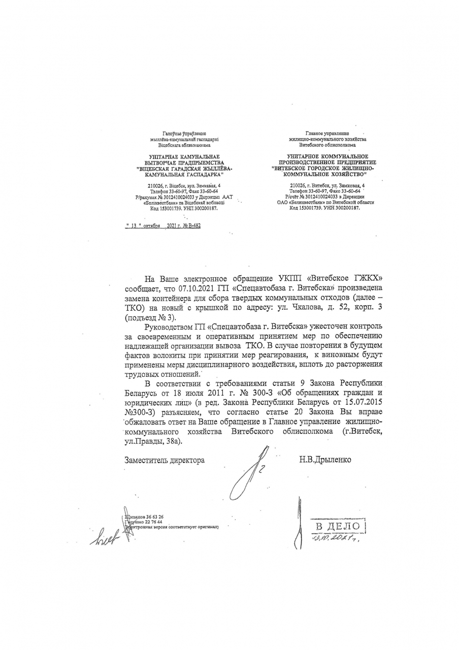 Предприятием «Спецавтобаза г. Витебска» произведена замена контейнера для сбора ТКО, расположенного у третьего подъезда жилого дома 52, корпус 3 по ул. Чкалова на новый контейнер с крышкой.