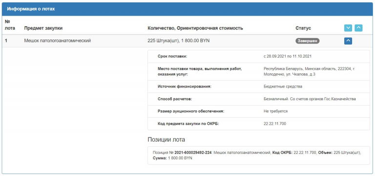 - апрель 2021 года: мешки патологоанатомические (225 штук); сумма закупки - 1800 BYN; срок поставки: c 28.09.2021 по 11.10.2021; закупка состоялась / https://goszakupki.by/marketing/view/453487
