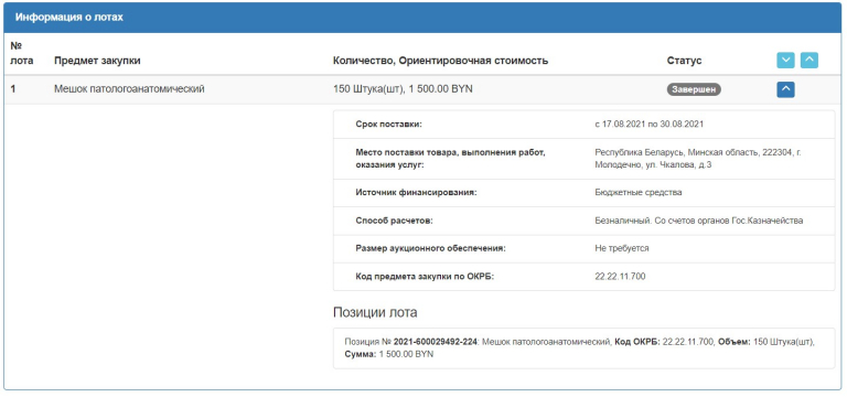 - сентябрь 2021 года: мешки патологоанатомические (150 штук); сумма закупки - 1500 BYN; срок поставки: c 17.08.2021 по 30.08.2021; закупка состоялась / https://goszakupki.by/marketing/view/416231